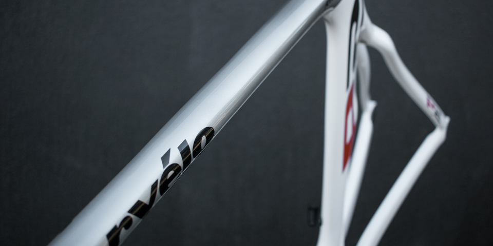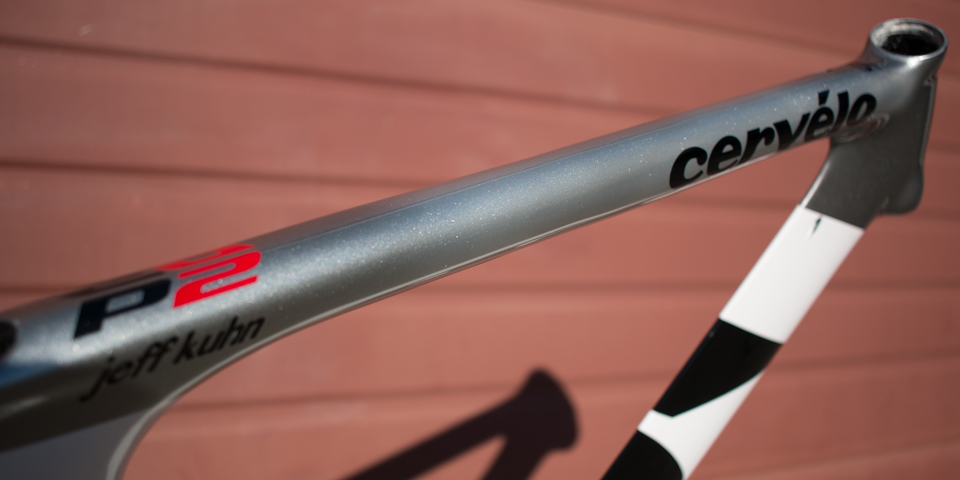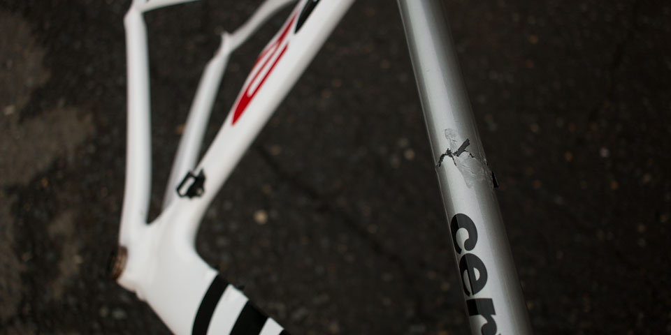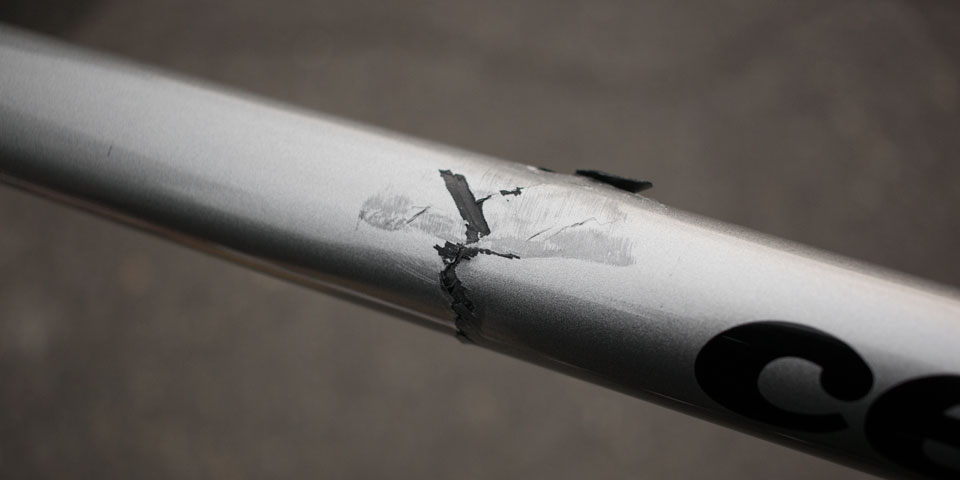 Handlebars: completely necessary to the safe operation of a bicycle, yet frequently the bane of a frame’s existence. This carbon fiber Cervelo P2 arrived at Ruckus for repair after the dreaded handlebar strike. A simple crash that usually results in massive damage, the handlebar strike occurs when the bars rip into the toptube, usually resulting in splintering, swearing and things of the like. Toptubes are becoming thinner and lighter due to manufacturers desire for gram reduction in frame construction, and therefore are one our mos common repair requests. So, with much wet sanding to remove the damage propagation and heavy casting procedures to recreate the tube shape, we were able to save yet another frame from the landfill graves. That speckled grey color was pretty tough to paint match as well! Are you a victim of handlebar strike? get in touch with us, we’ll mend you back together again.
