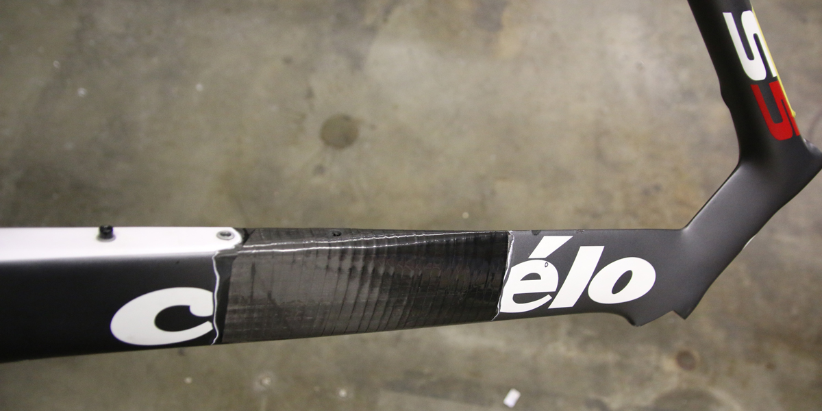 Downtube repairs are some of the most common repairs we perform; they require immense patience when removing the damage, an accurate layup, and usually an interesting way of extracting the resin from the laminate. This Cervelo arrived for carbon fiber repair and we were able to turn it quickly and cleanly.