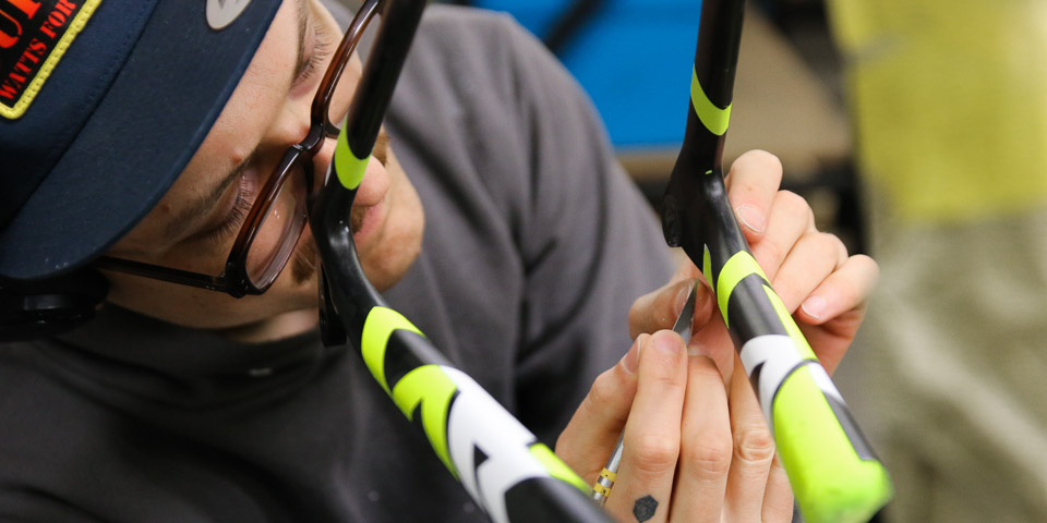After the masking application there’s the delicate art of paint mixing to a neon-yellow-green color which is an extremely difficult task in itself… mind-numbingly difficult, really. Then there’s the actual painting which we perform in our brand new filtered clean/paint room. The bike then goes into the oven for a paint curing cycle, after which nick takes a razor and removes all of the tape from the masked areas. Delicately, of course, because we wouldn’t want to strip off a piece of paint that may be slightly attached to the tape. You can see him performing this step in the photo above. We don’t only see red frames and want to paint them black.