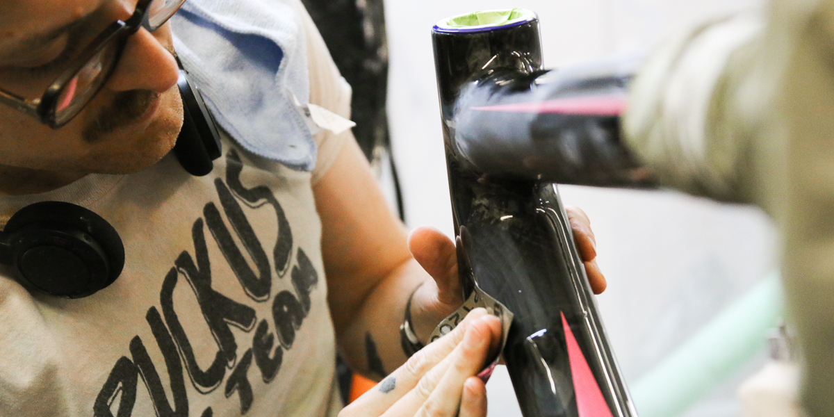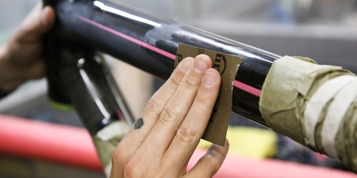 As you can see from the fork images, the accident was pretty substantial. As always, we first ultrasound scanned the frame, which was a pretty exhaustive process involving what is essentially the tubing of two bikes. We found absolutely no damage to the frame, undoubtedly due to the amazing quality production. Since the frame was just perfectly structurally sound, we sent it directly to our paint department for lots of wet sanding and buffing out the minor superficial blemishes from the accident.