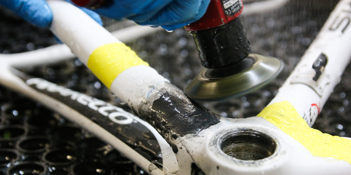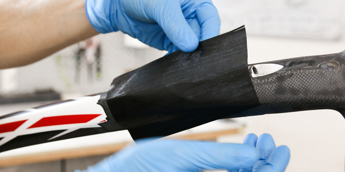 After much scanning and damage removal, the Pinarello was finally ready for repair. It was not easy to recreate the layup structure around Pinarello’s famous asymmetric tubes, but we were able to recreate it brilliantly. We ultrasound scan bikes and fully remove all the damage to make certain the frame is completely safe to ride again and as close to the original structure as possible.