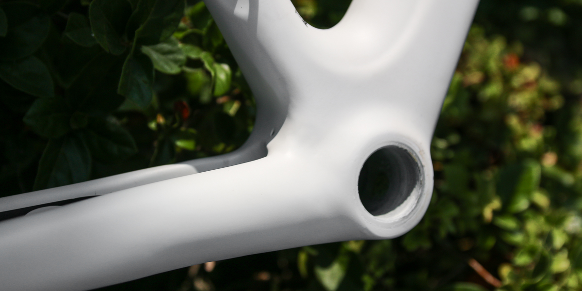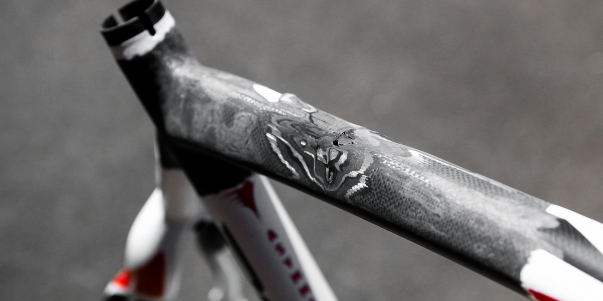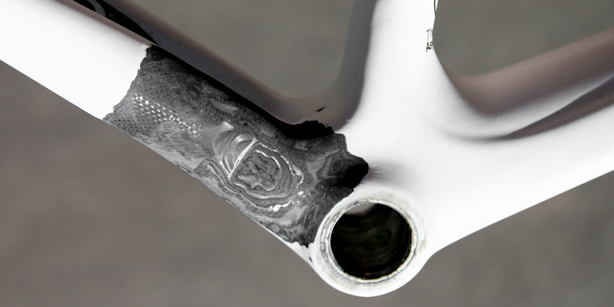 Somehow, the handlebars and fork cleared the garage but the toptube took the brunt of the impact. After sanding away the obviously damaged area, we discovered quite the impressive carnage. The impact damage resulted in several large holes through the carbon and a spider web of cracking laminate. This repair needed several layers of carbon to match the structural layup of the bike, and also received an aesthetic weave layer to nearly perfectly match the original frame.