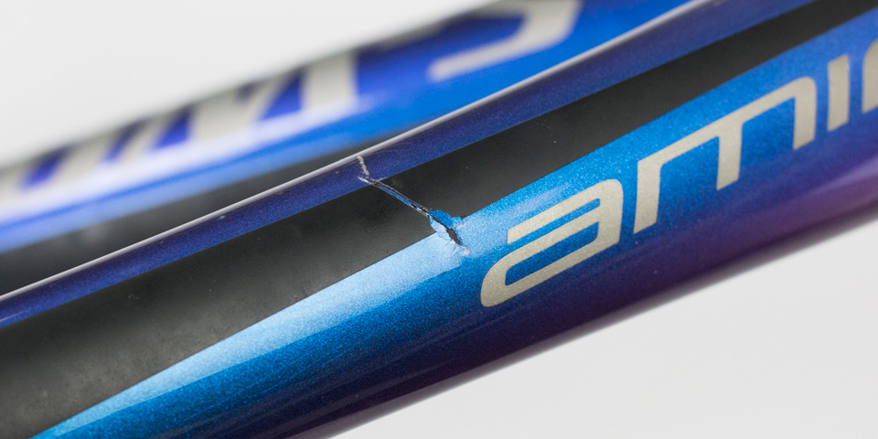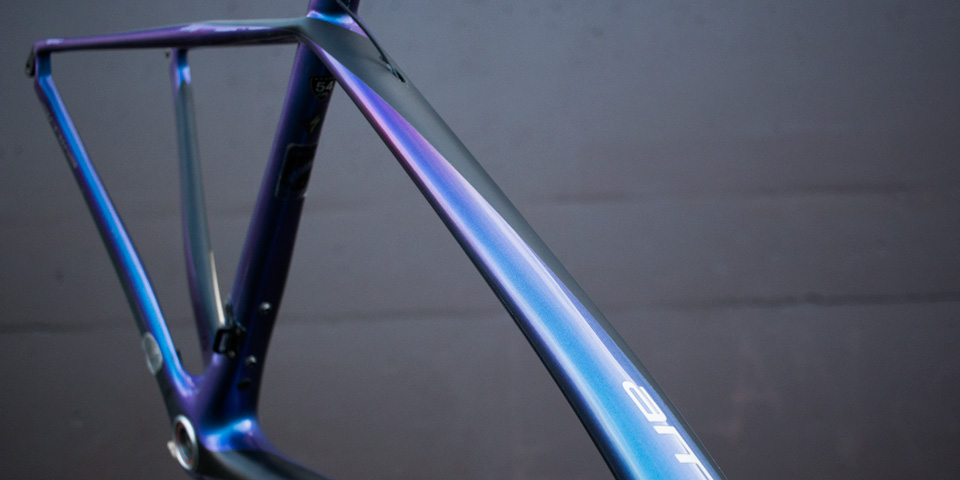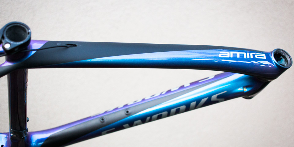 Paint matching is a delicate and time consuming art. Luckily, we have more than one paint wizard in-house. This Specialized S-Works Amira carbon fiber frame arrived with a quarter-sized crack in the toptube. The repair is a basic one for us, but matching that purple-to-blue sparkle fade sure was tricky…and we nailed it. There’s nothing we love more than sending a bike back to a customer knowing they are going to be very excited when they open up the return box!