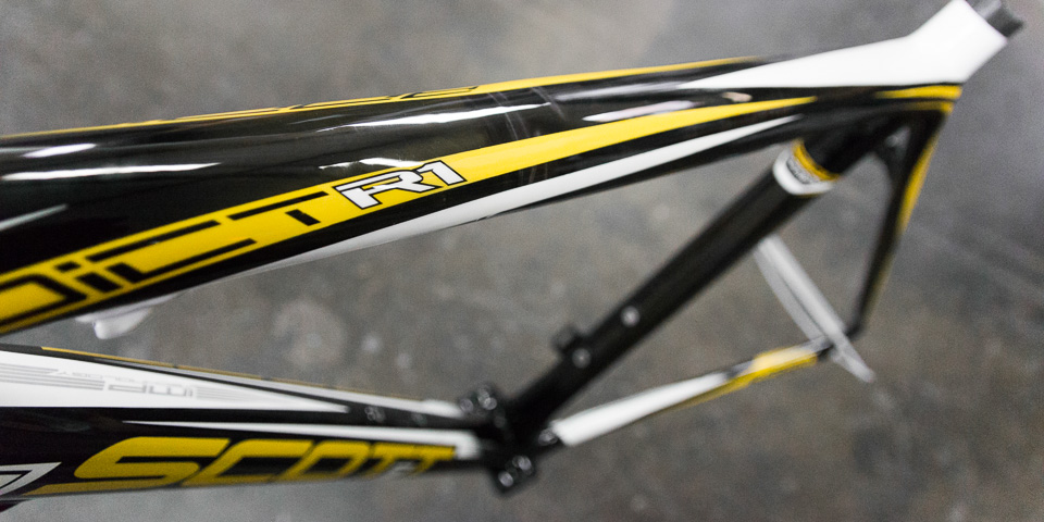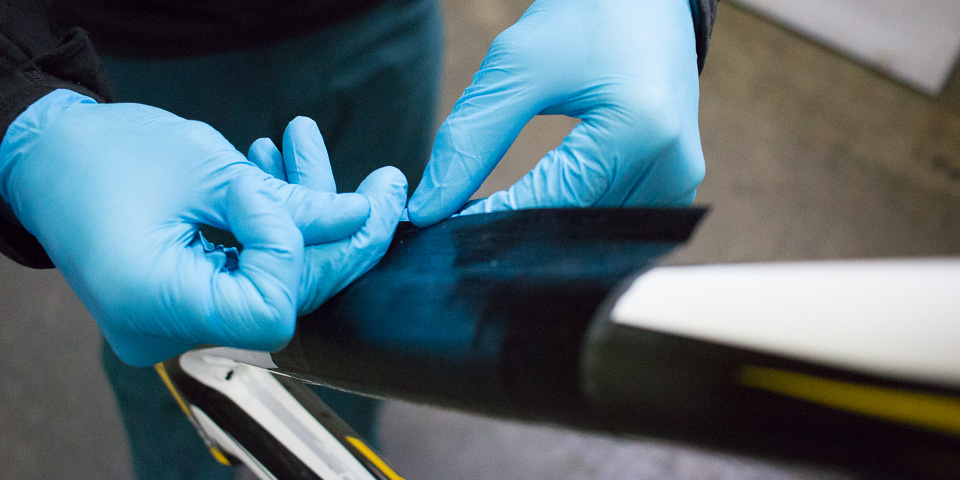 Toptubes are easily the most damage prone tube on a carbon fiber bike frame, and undoubtedly the repair request we receive the most. This Scott Addict came to us after our customer had dropped the bike and made a small ding which propogated up the toptube towards the headset, following a seam in the carbon fiber. As always, the first step of our repair process is material and damage removal. The video below demonstrates one of our repair technicians wet sanding off the damaged area. In order to create, we must first destroy.