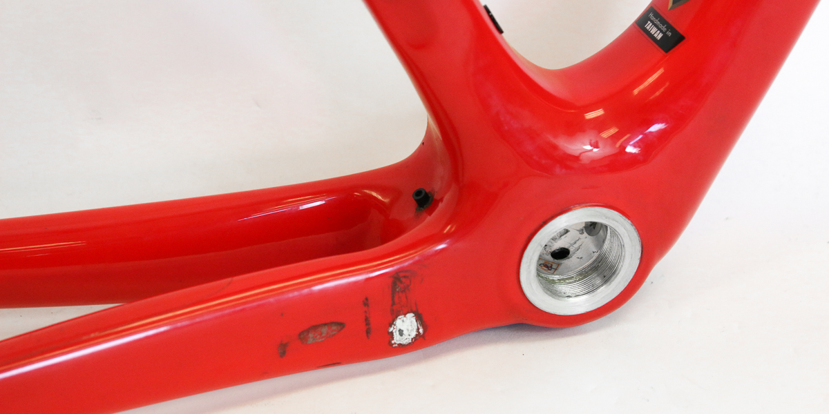 Our customer was concerned about the cost of repair, so they asked us to only repair and repaint the damaged areas. One area we found was a moderate patch of chain suck on the drive side chainstay. With carbon, looks can be deceiving and there is also so much more than meets the naked eye. So we took the thickness measurement from the opposite side of the frame and compared it to the area of chain suck. What we found was no real damage, just some superficial paint removal.