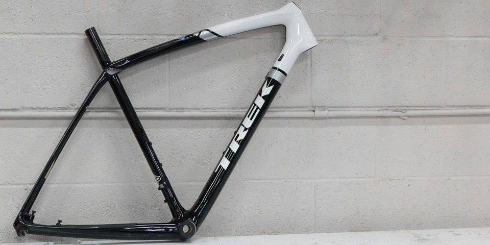 The off-season is the perfect time to repair a busted carbon fiber bike frame. For may of us, cyclocross is an out-of-sight out-of-mind kind of discipline; arriving and leaving in a fervor mostly destroying all gear in its path. That’s exactly the case for this Trek Boone frame: our customer sent it to us after months of neglect, hanging lowly and saddened in the garage. What originally happened was the bars tweaked all the way to the driveside after a crash, resulting in a quarter-sized crack along the top tube.