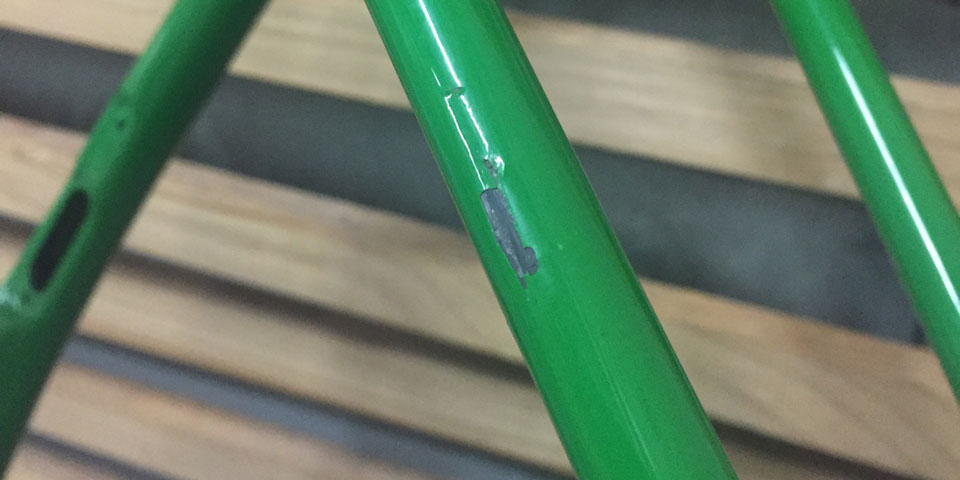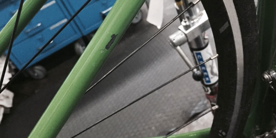 There’s only one thing worse than crashing, and that’s crashing your brand new bike. This Trek Emonda SLR carbon fiber frame is the world’s lightest production road bike and was in the hands of our customer for only a matter of weeks before the accident. We don’t have the details of how it happened, but we do know that the seatstay was damaged. At first glance our customer thought it was just a paint chip but the damage actually resonated deeply into the tube. It’s important to check your carbon fiber bicycle regularly because subtle damages can easily remain hidden in plain sight. If you do find damages, please get in touch with us! We’re always more than willing to help you figure out what to do next.
